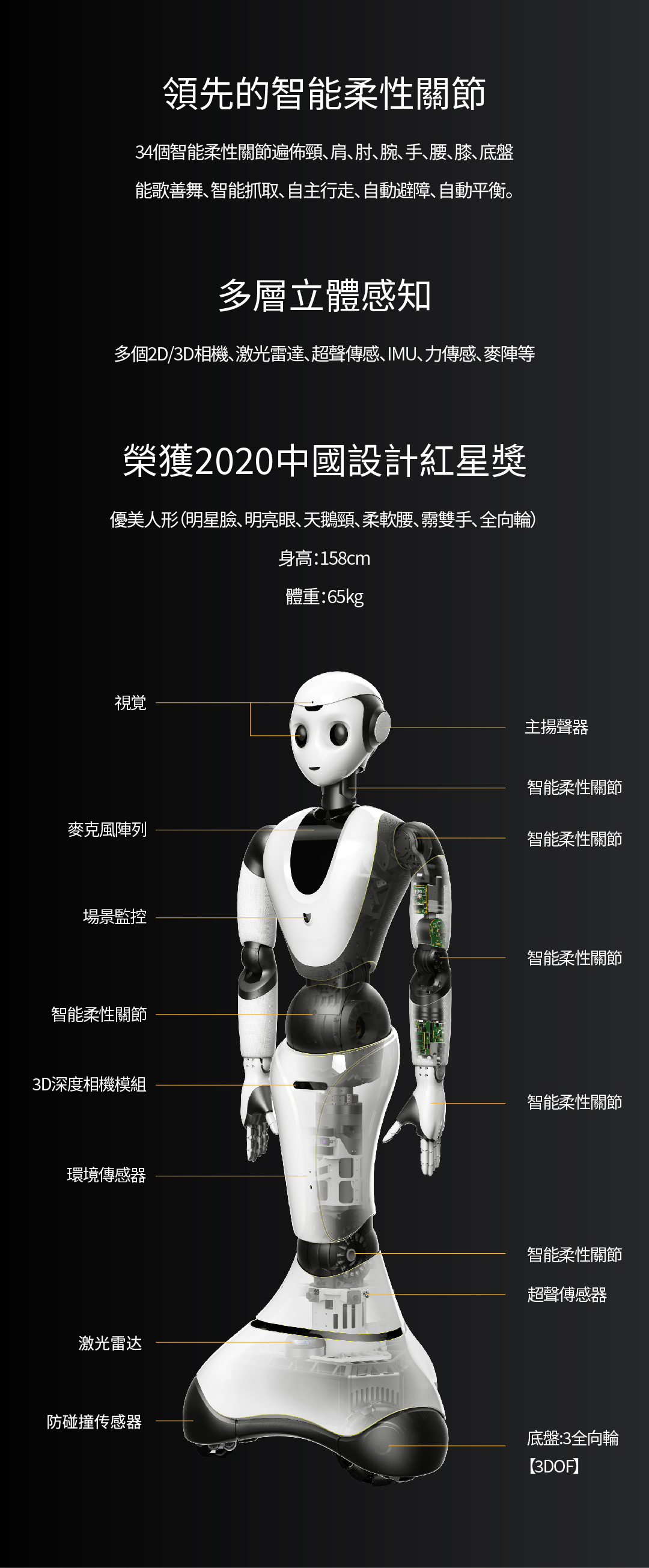 34個智能柔性關節遍布頸、肩、肘、腕、手、腰、膝、底盤